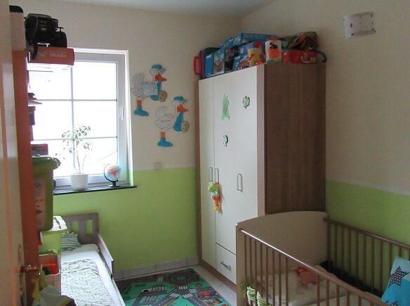Die Wohnung ist aufgeteilt in einem Wohnzimmer, Schlafzimmer, zwei Kinderzimmer, Diele, Bad mit Duschwanne und Fenster.